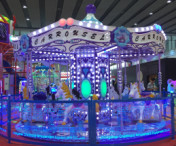 This is another carousel. It is beautifully decorated with a variety of lights, predominantly in purple and white, giving it a charming and enchanting appearance. The carousel features a circular structure with numerous decorative elements and a central column. The seats on the carousel are designed in the shape of various animals and characters, adding to the whimsical and fun atmosphere. The base of the carousel is surrounded by a blue railing for safety. The surrounding area seems to be part of an indoor amusement facility, as indicated by the visible ceiling and other attractions in the background. Overall, this carousel creates a delightful and inviting environment, likely attracting many visitors, especially children, who would enjoy the ride and the magical ambiance it offers.