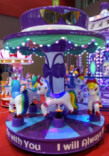 This is a colorful carousel. The main structure is mainly purple, with green decorations on the top. There are multiple cute-shaped seats on the carousel, including images of unicorns, etc. The seats are brightly colored, such as white, blue, and pink. The base features a blue and white striped pattern, and there are guardrails around the base. Some words can be seen on the side of the carousel, like "misses You" and "I will always", giving a warm and romantic feeling. Overall, this carousel is full of childlike fun and a dreamy atmosphere. It should be placed in an indoor amusement place, attracting children and adults who still retain a childlike heart to come and experience it.